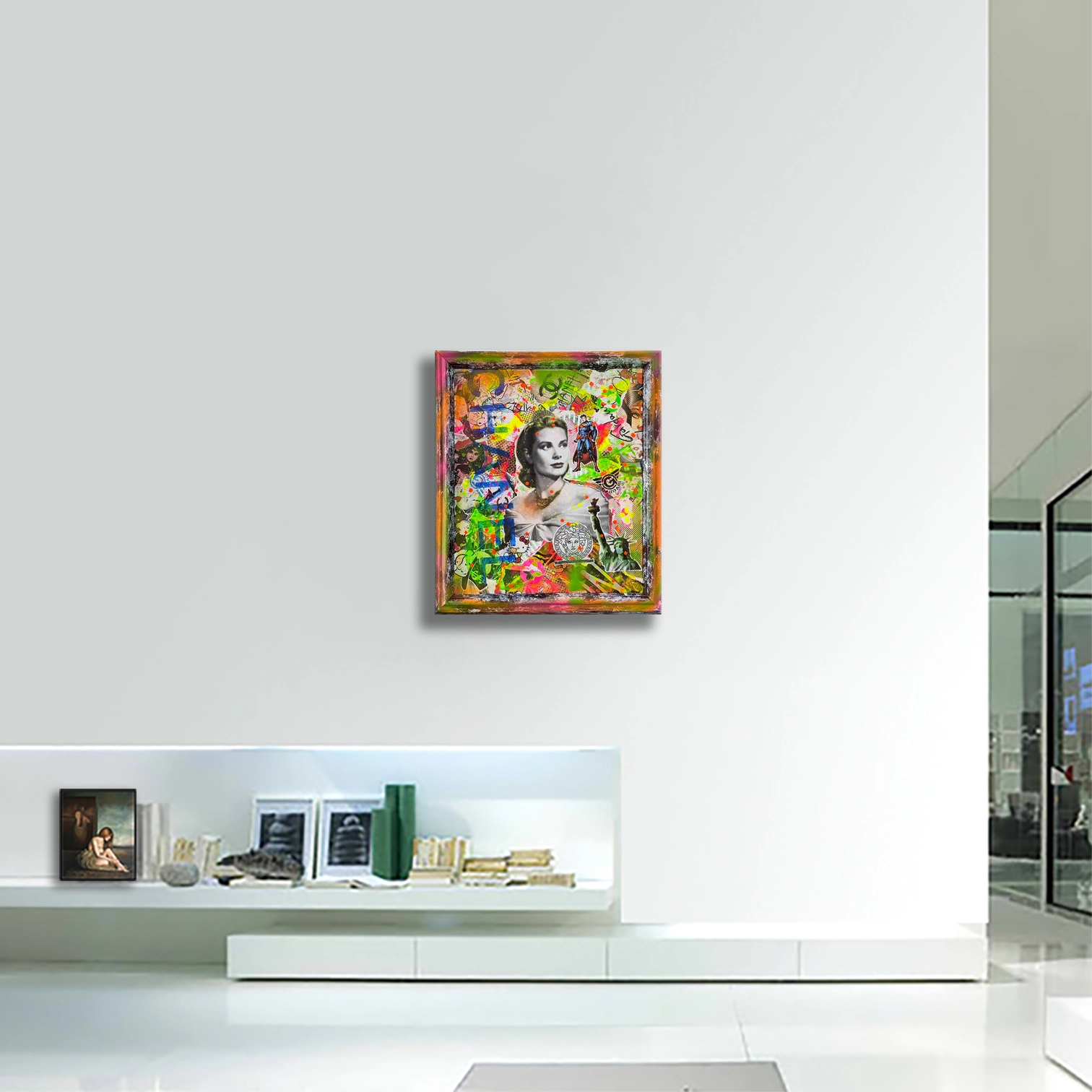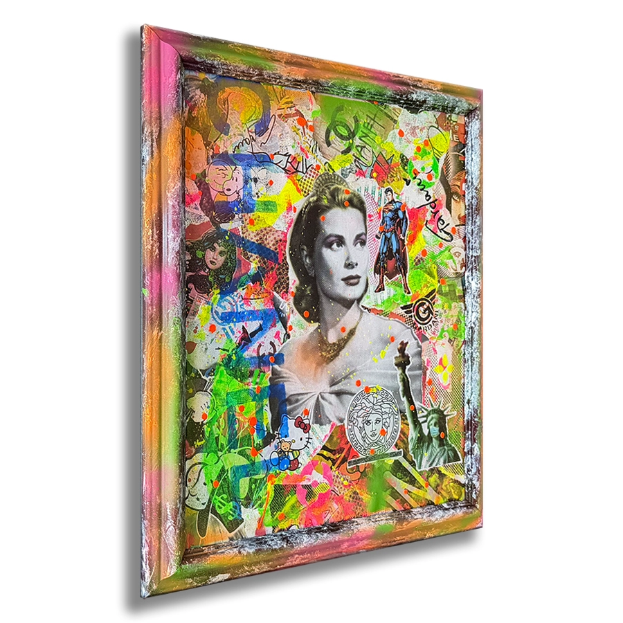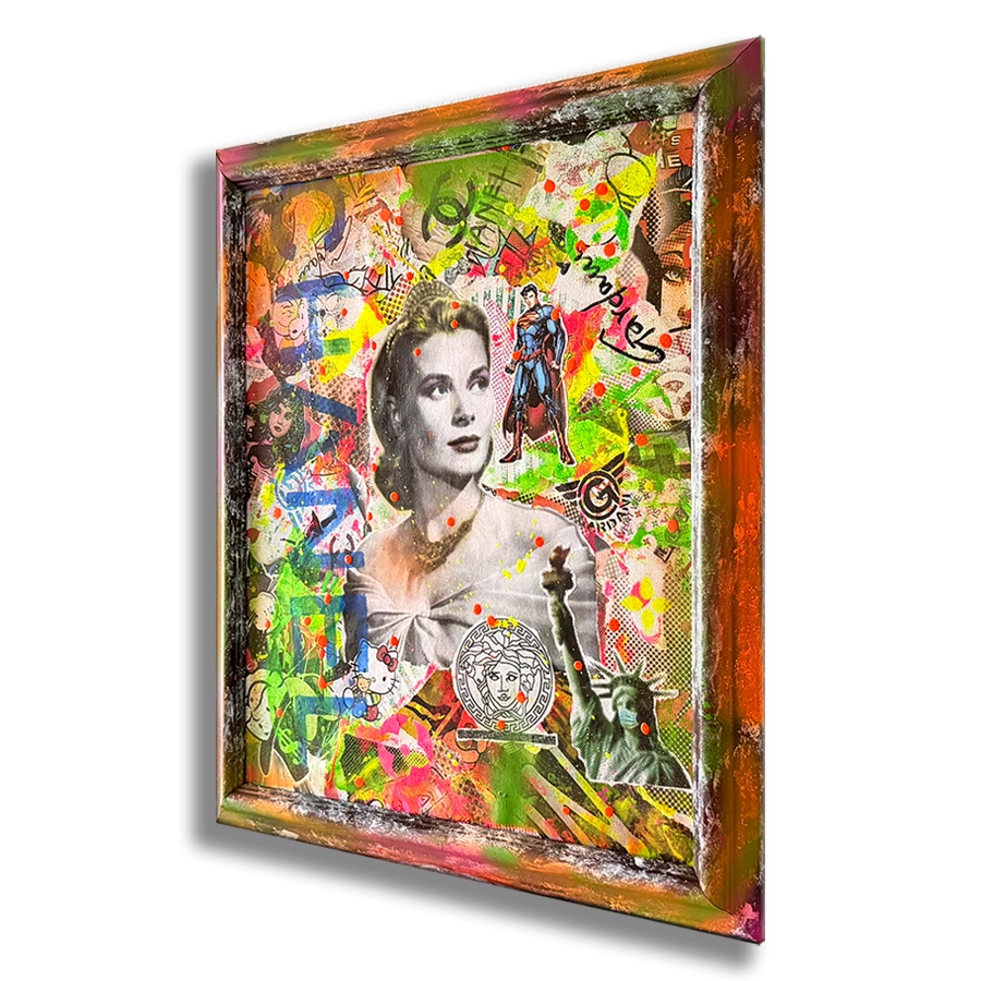 Medium: Mix media, silk screening, hand finished with Oil, Acrylic, stencils, spray paint, Collage with old iconography images, newspapers, comic books, magazines and text on canvas.