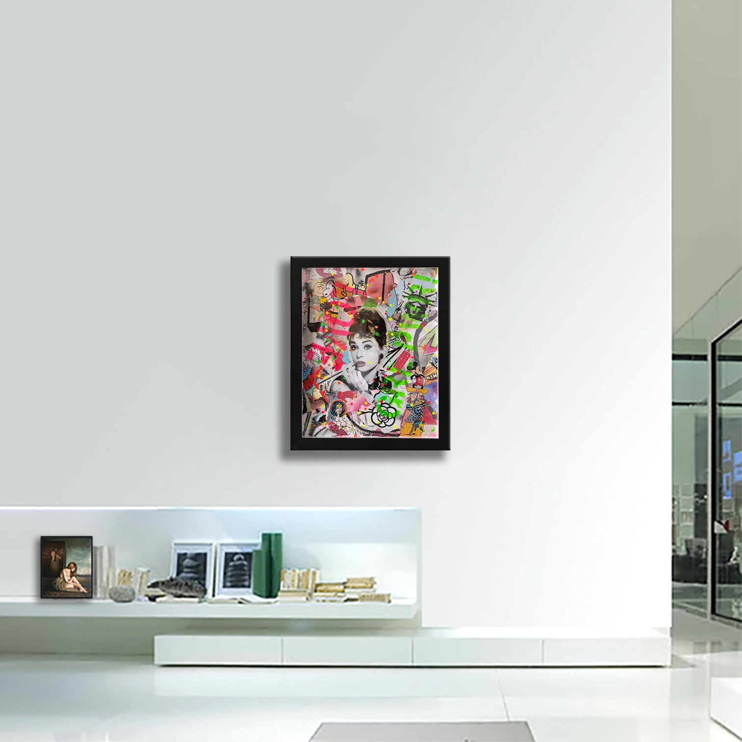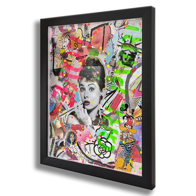 Medium: Mix media, silk screening, hand finished with Oil, Acrylic, stencils, spray paint, Collage with old iconography images, newspapers, comic books, magazines and text on canvas.